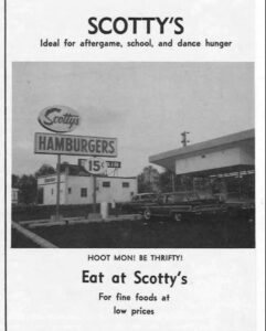 opened around 1962. It was an immediate hit with teenagers, who could afford the fast food prices. There was no indoor seating so you parked and ordered and took your food back to your car to eat. The menu was simple: 15-cent hamburgers and 10-cent fries, sodas and milkshakes. It is hard today to understand the impact of the first fast food places – they are everywhere today. But in 1962, Scotty’s was It!