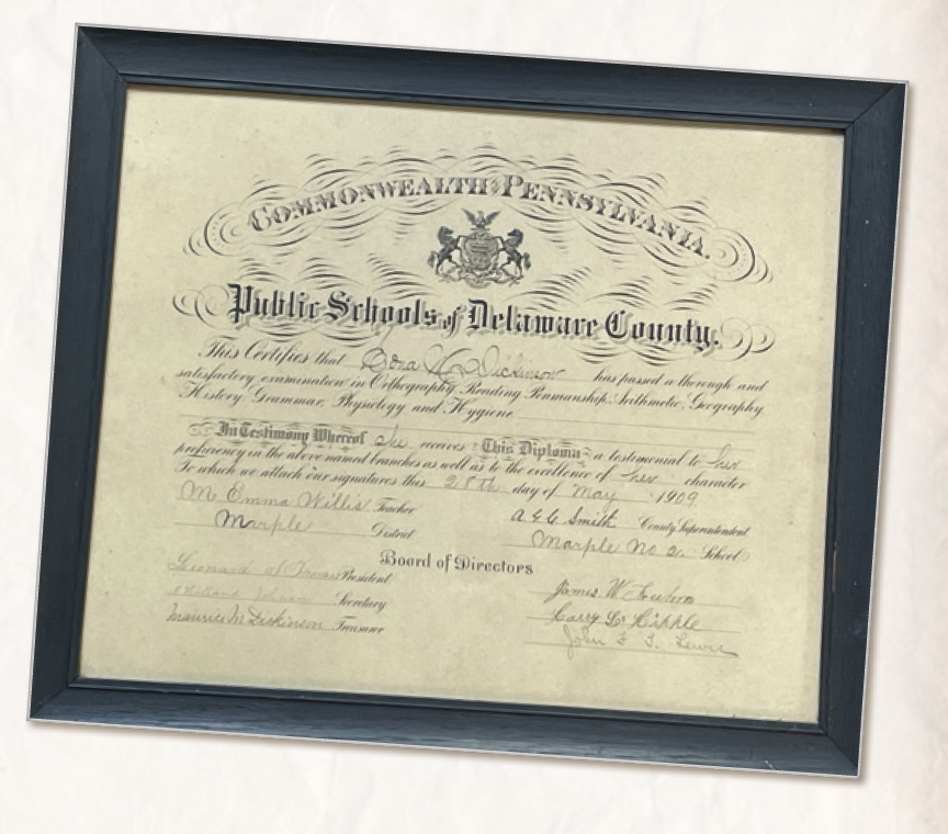 Miss Dickinson’s diploma noted her studies in orthography, reading, penmanship, arithmetic, geography, history, grammar, physiology and hygiene. The whole Marple graduating class of 1909 was likely less than 10 students. In nearby Newtown, also a small farming community, the story was the same. Their high school-aged students attended a red brick schoolhouse on Rt 252 with all of the other grades within walking distance of that school. In that building of three rooms, three teachers taught ten grades, including a two-year high school curriculum.